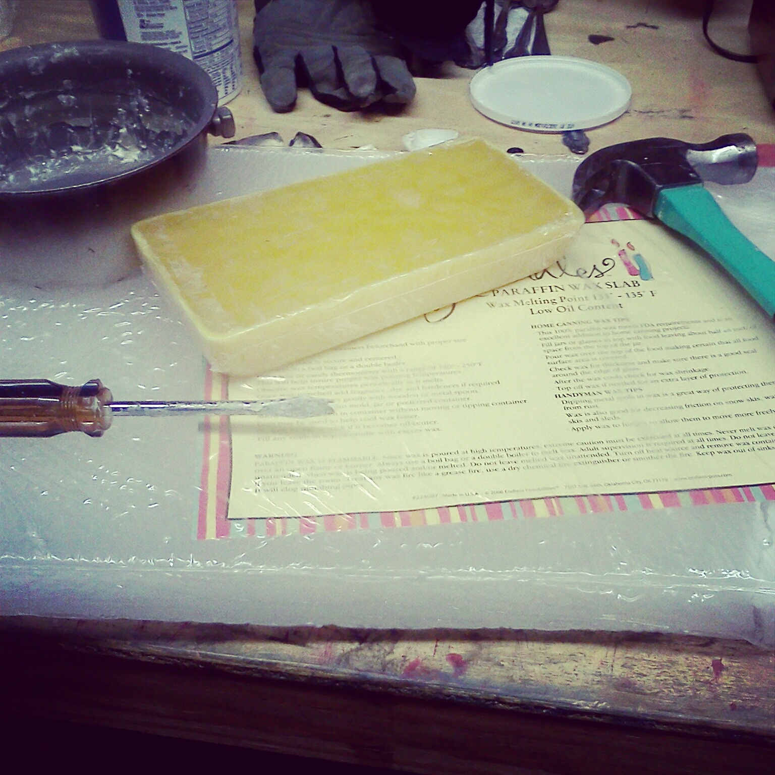 Bash up your wax into small chunks and measure it out into your smaller pot or soup can. My blend for this round, 8oz. Paraffin / 4oz. Bee's.